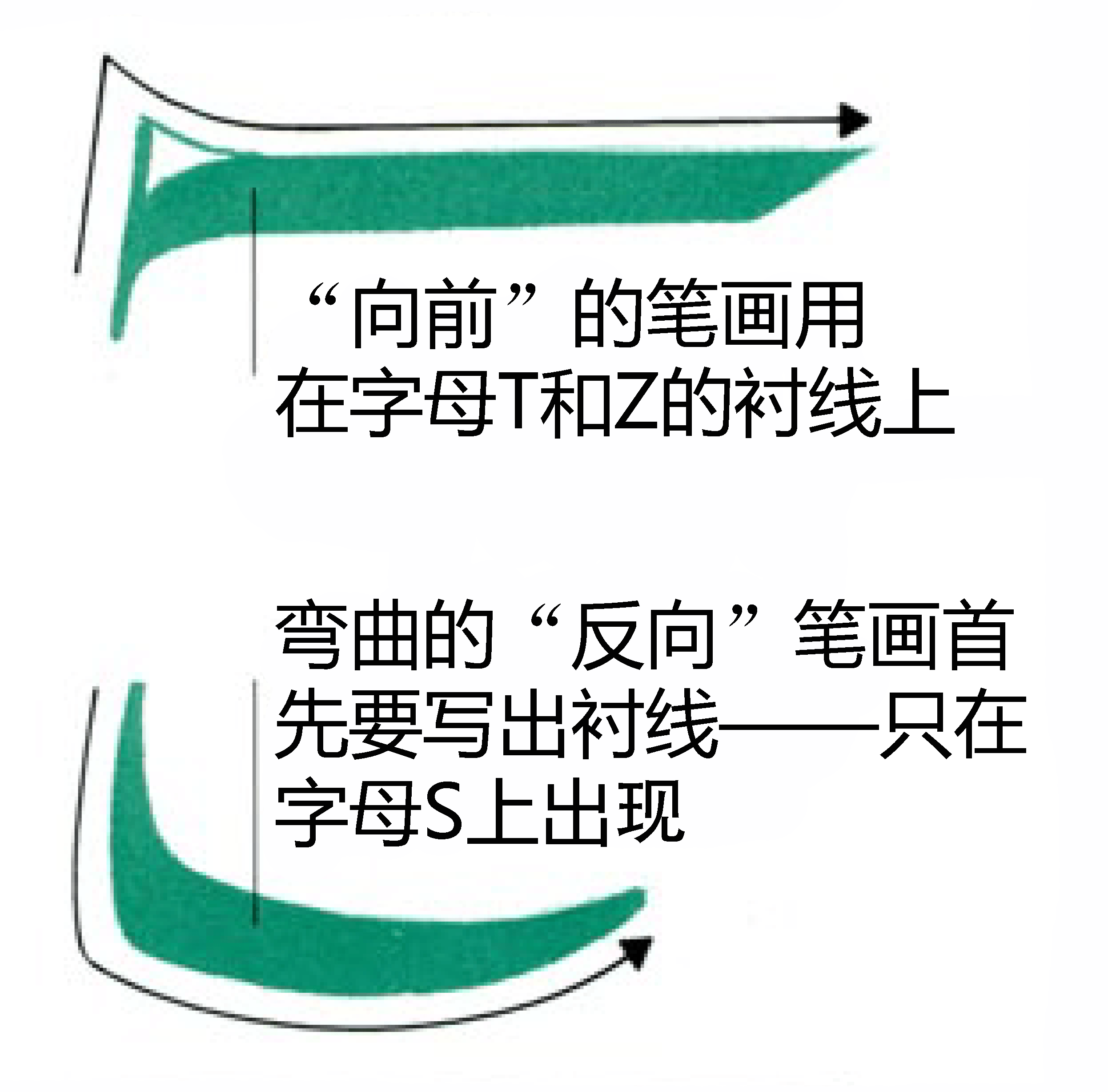 “拖笔”需在180°之间扭转笔杆。拇指和食指夹住金属包头,笔杆和书写面保持约90°。“拖笔”主要可以写出以下四种帝国大写体的衬线:
