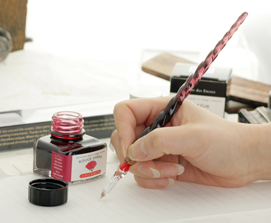 和羽毛笔不同的是,玻璃蘸水笔是很年轻的一种蘸水笔。笔身和笔尖用玻璃制成,晶莹剔透,颜值超高!