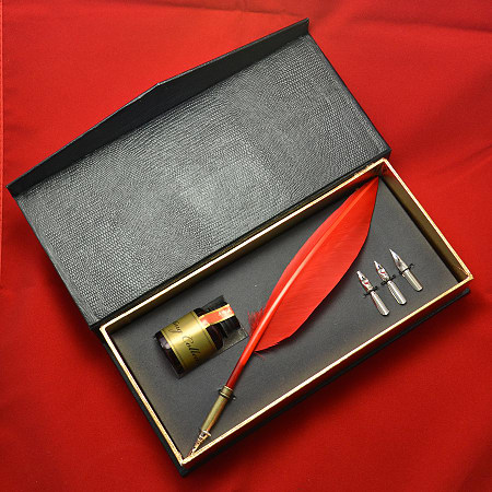 羽笔无论在羽毛的选取上和笔杆和笔尖部分金属材质上都非常考究的。笔杆处具有精美雕花,造型独特。笔尖有更进质量,一般沾一次可书写100-110个英文字(中文则是60-70个)。满足喜爱人士的书写要求。